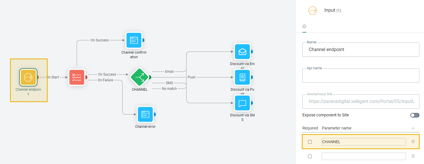 - A parameter with name Channel is transferred through the Input entry component of this journey.![]()
