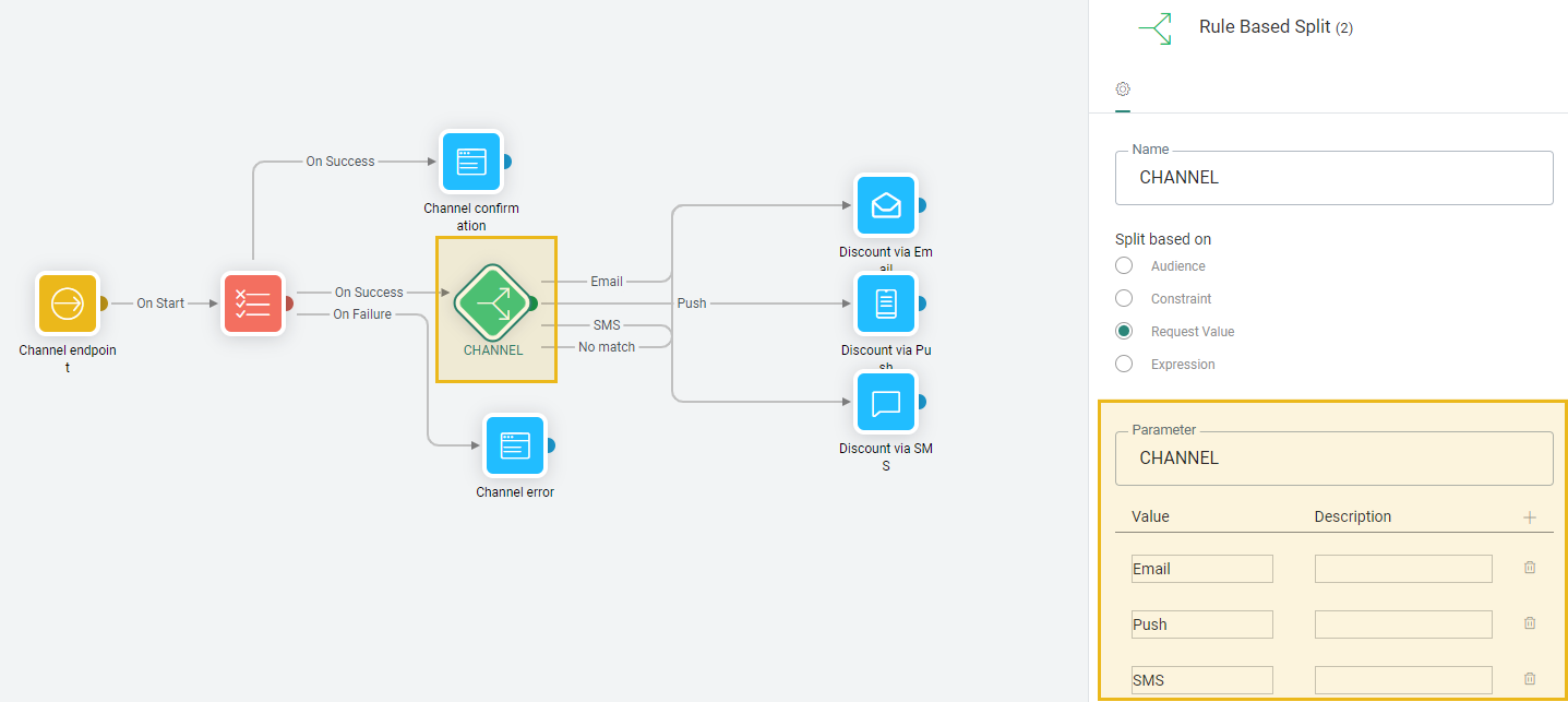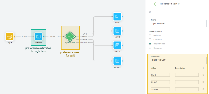 Split based on a Request Value — When using the Rule Based Split Component in a journey with one of the following entry points: Input, Inbound Event, Retargeting Event, Abandoned Cart Event, the parameter value can be requested and used for the split.