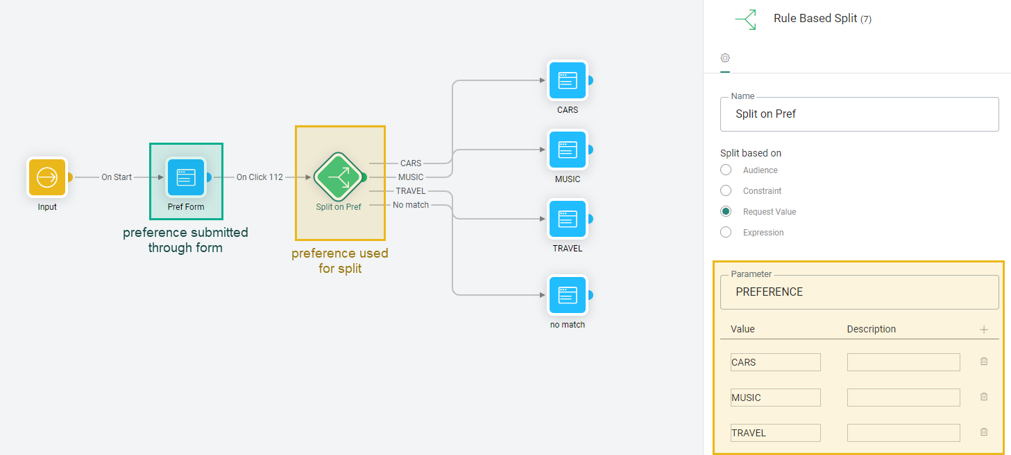 Example 2: The contact submits their preference through a page form. The posted preference value is then used to split the journey into multiple paths (being Cars, Music, Travel, or no match).![]()