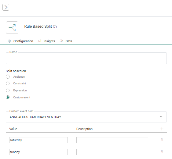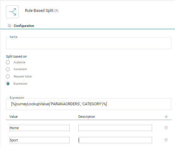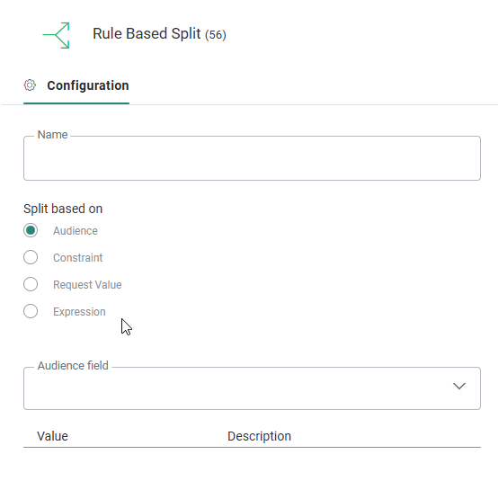 Name — This will be used in the journey canvas to describe what the component does. Make it as explicit as possible. When a constraint is used for the Rule Based Split Component, this name will be the same as the name given to the constraint.