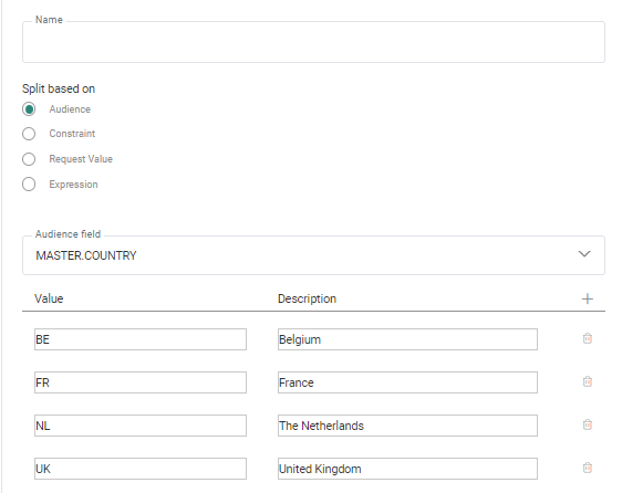 Split based on — A choice can be made between Audience field, Constraint, Expression or Custom Event.