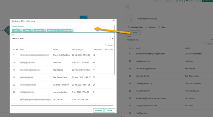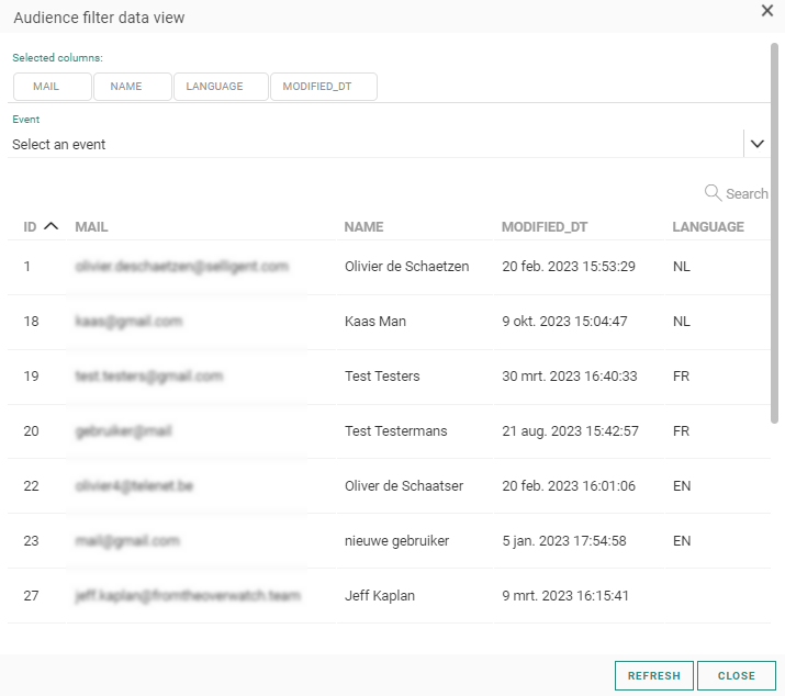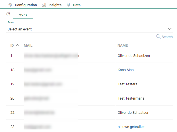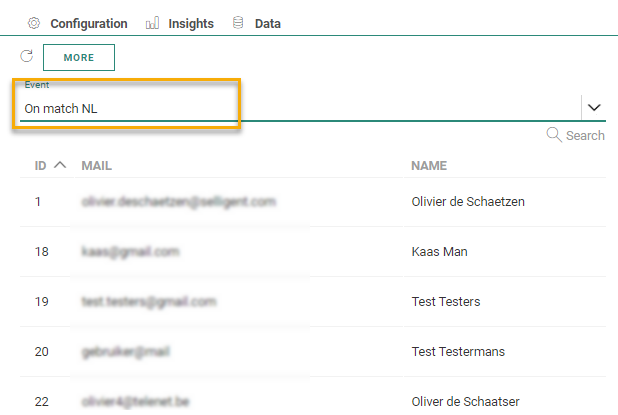 The Data tab provides an overview of all contacts that arrive in this step of the journey, with their name, email and unique ID. You can search for a specific contact in the list using the Search field.