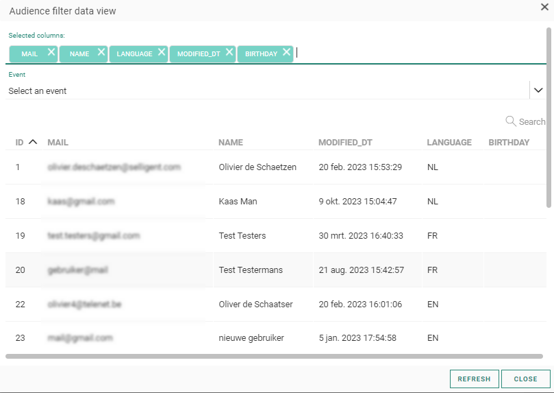 A default set of fields from the Audience List is provided, but you can add additional fields for an even more detailed view on these contacts. Click in the selected columns field to access the drop-down of all available Audience fields and select the ones to add to the overview: