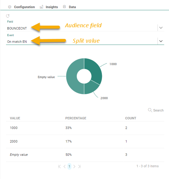 There are 3 tabs in the properties panel: the Configuration tab containing the component properties ;the Data tab with the target contacts details; the Insights tab showing the distribution of the targeted audience.