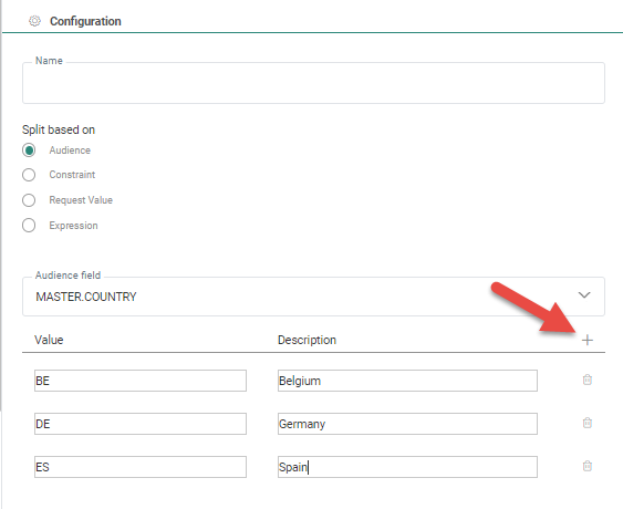 For example, for the Country field, you could enter the values BE,DE, ES etc with their respective descriptions Belgium, Germany and Spain. The descriptions are used in the journey to define the links between components. If no descriptions are provided, the value is used.