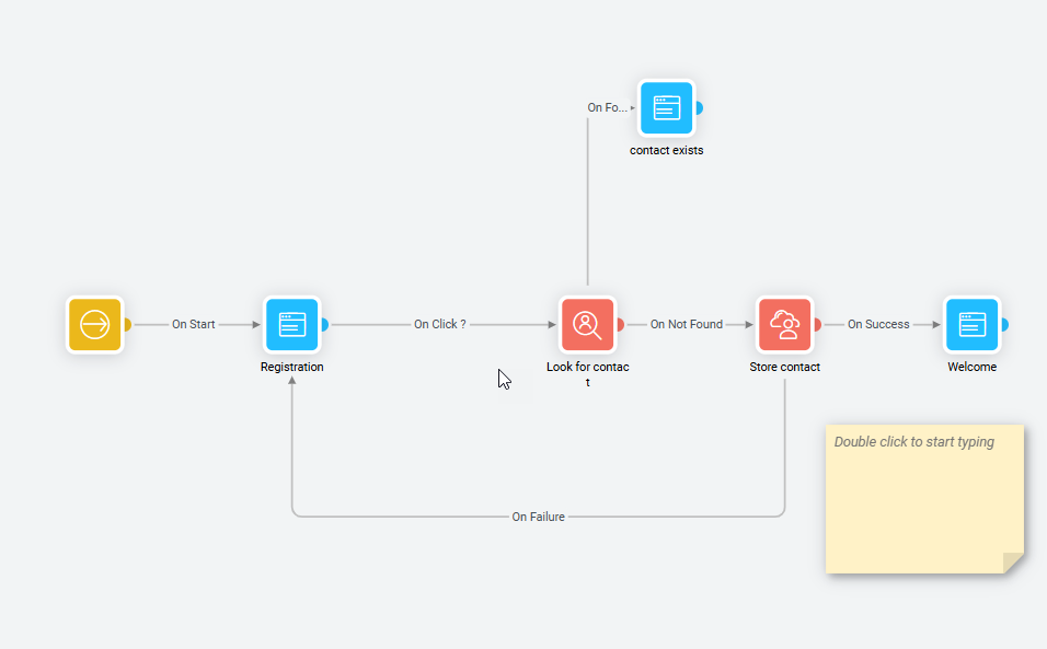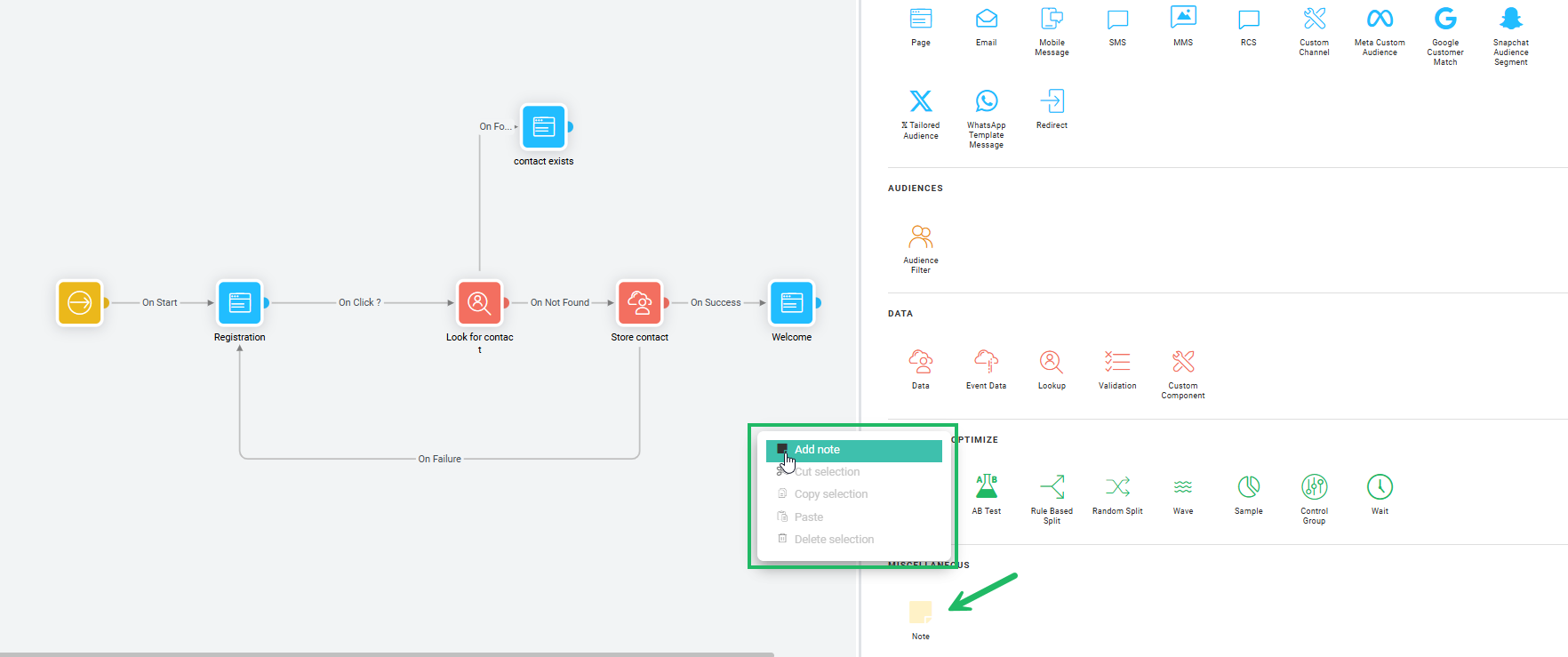 Notes can be added at any position on the canvas and are not necessarily related to a specific step in the journey. Note blocks are created at the position from where the right click pop-up menu is called and a maximum of 512 characters is allowed.