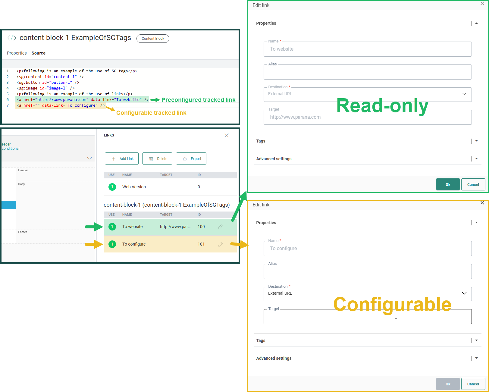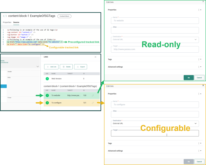 Links can be added to the Content Block as well. Depending on the syntax used, links will be tracked or not when used in a message.