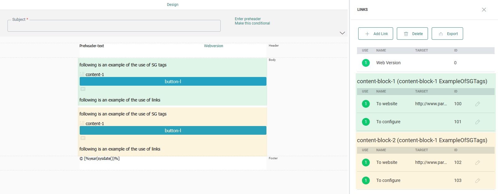 If we add the same Content Block twice, a second section is added with the links in the second Content Block. Although the same Content Block is added to the message, the configurable links can be configured differently.