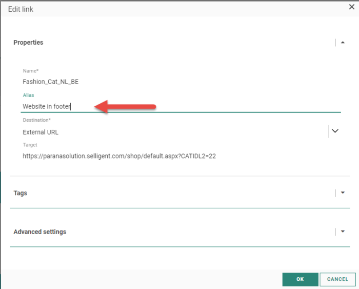 In the Links section, click the pencil icon next to the link to display the Properties dialog and define an alias.