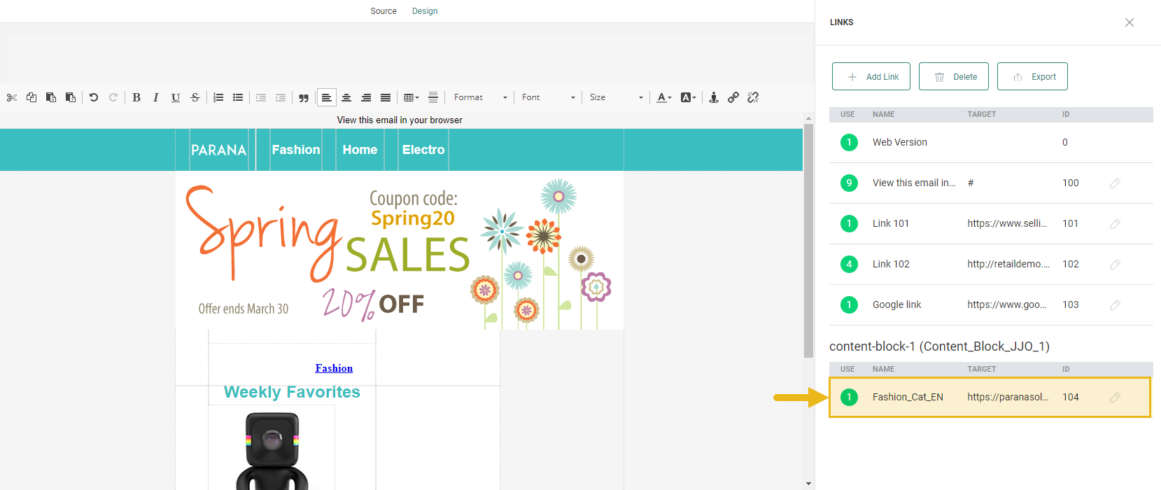 When the Content Block is used in the message, the link appears on the right, in the Links panel.![]()
