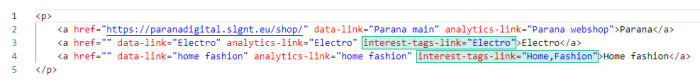 The attribute interest-tags-link is added to the link tag. The tags are separated by a comma.