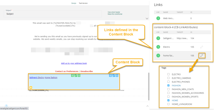 When creating a Content Block with links, you can now tag these links with Interest Tags as well. This is done in the following manner: