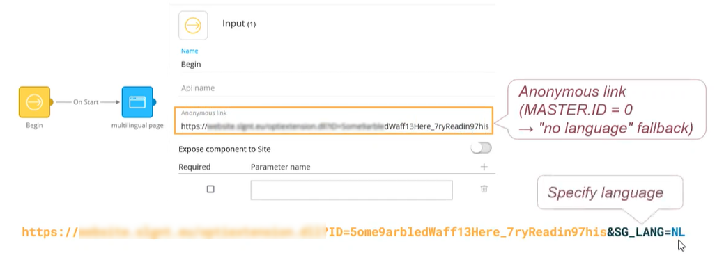 - If you want to test the translation for a different language than the fallback language, add the following parameters to the anonymous link: &SG_LANG=NL for dutch for example