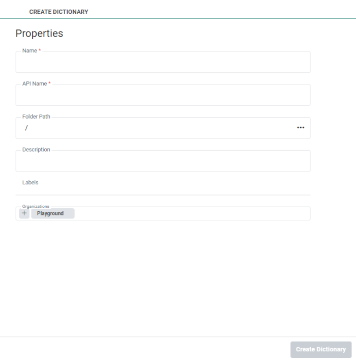 To create a new dictionary, select +New in the toolbar at the top and set the properties for the dictionary: