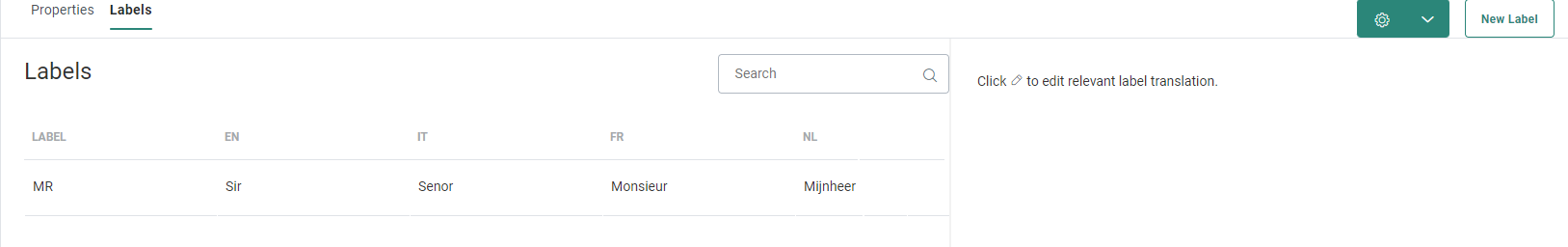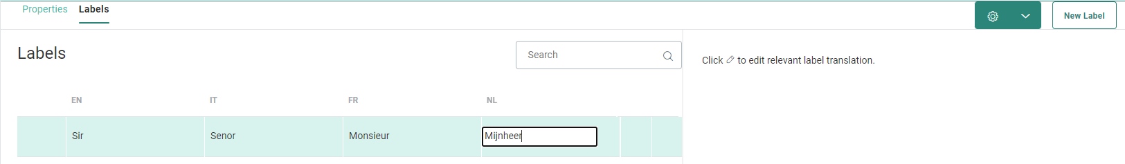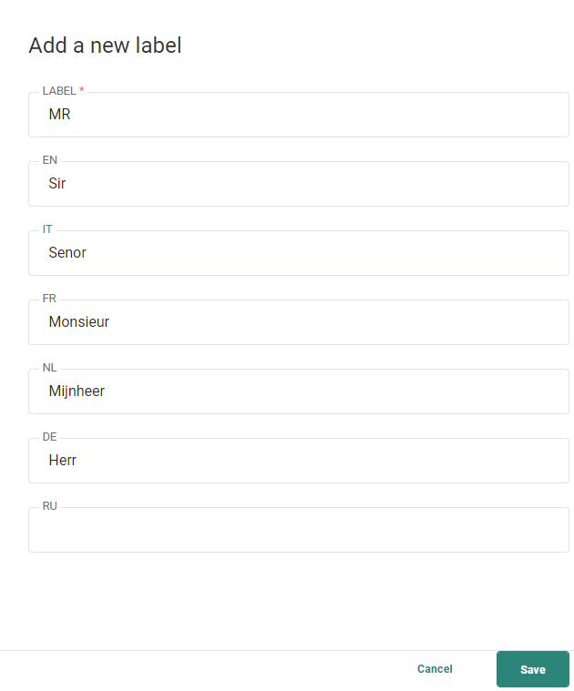 Example: Label can be MR, and the translated values Sir (EN), Mijnheer (NL), etc.