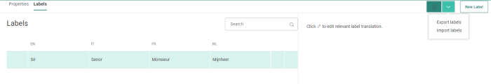 Labels are exported to a CSV file with one column for each language and one for the label. This allows you for example to send the labels to a translations office and afterward import the translated values.