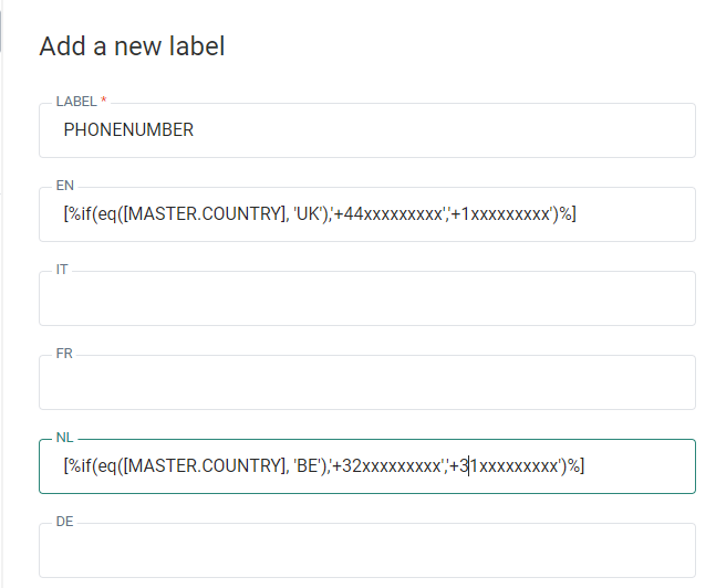 A possible use case is when a phone number needs to be displayed in the message. Labels work with languages and depending on the language of the recipient, the corresponding translated label is shown. However, in this case, phone numbers do not only depend on the language but also the country the recipient is in. By using expressions, the phone number can be automatically adapted to the country of the recipient.