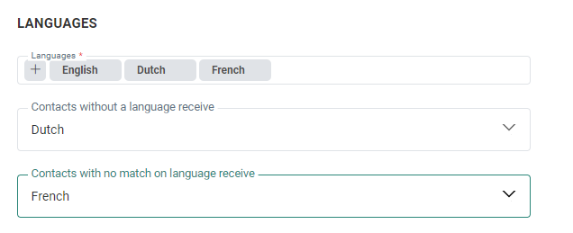 - Contacts with no language specified will receive the Dutch message (empty language falls back to Dutch) and thus see the label : "Mijnheer".