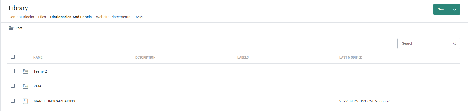 The Labels section in the Library presents an overview showing all existing dictionaries: name, description, date of the last modification and any labels/tags associated with that dictionary. Dictionaries are stored in folders, following the same folder structure and management as other chapters. (More details on folder management can be found here.)