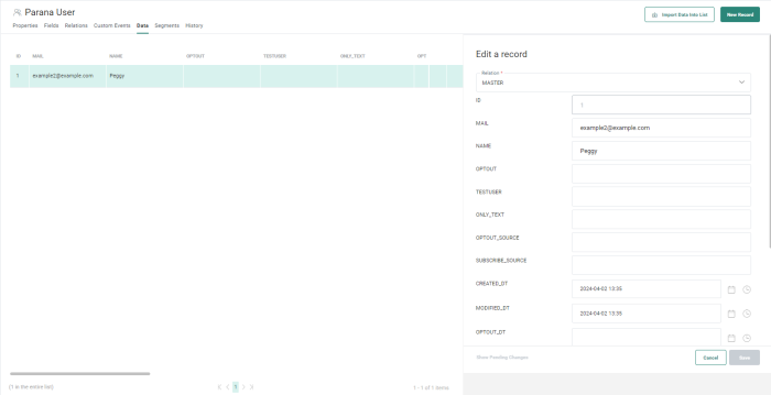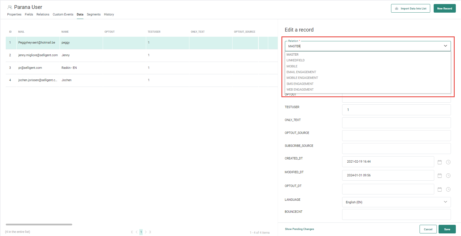 2. You can choose between adding or editing information for the main record in the parent list or for a record in a 1:1 linked list. Use the Relation drop-down field to select the parent list or the 1:1 linked list.