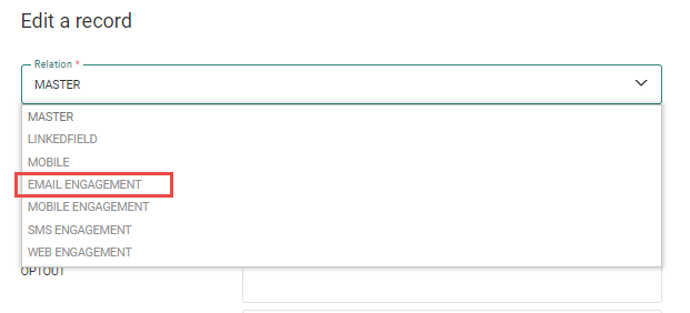 Note: When the Engagement Metrics feature is activated, an additional profile extension is available from the Relations field on the Data tab: Email Engagement. This profile extension contains all engagement data gathered for the contact.