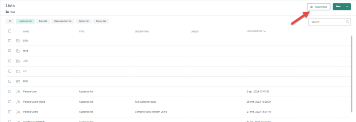 - From the Lists Start page, through the Import data button. You can import data into any existing list or an existing or new static segment.