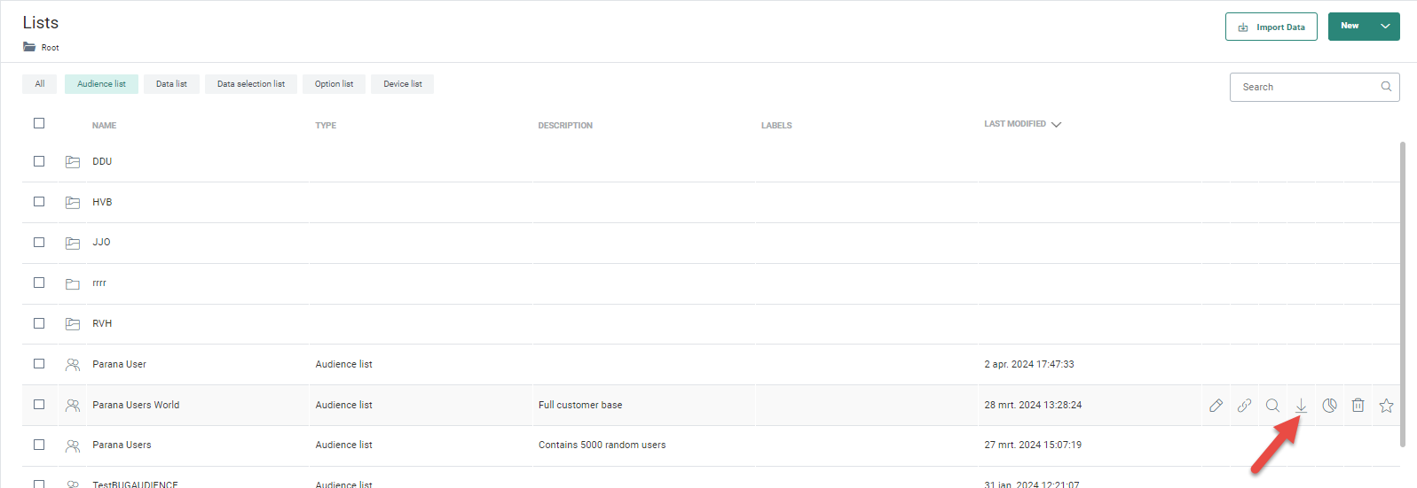 - Through the import data icon for a specific list on the Lists Start page (after hovering over a list with the mouse cursor). Records are imported into the selected list or an existing or new static segment.