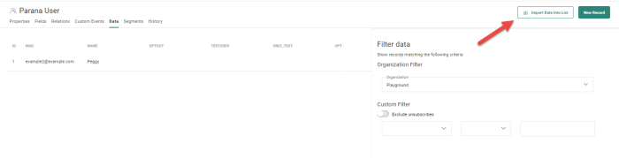 - From the Data tab of a list. Records are imported into the selected list or an existing or new static segment.