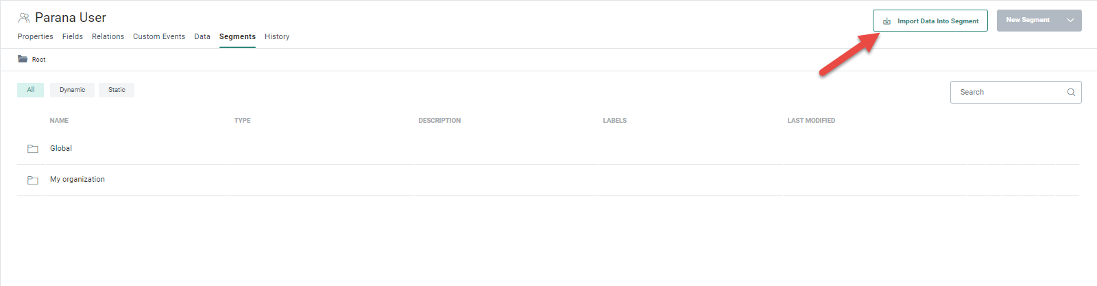- From the Segments overview, through the Import data into segment button available for static segments.
