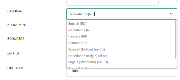 Note: If a field contains an option list, the values will be displayed in the language of the user, followed by the code.