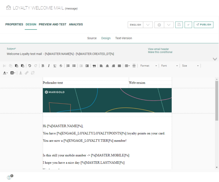 In this email, you can use transactional data and field values that are stored in the main Audience List (MASTER.xxx) and the extended Loyalty profile (ENGAGE_LOYALTY.xxx).