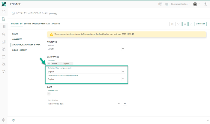 As all existing languages in the Business unit will be available for selection in Loyalty when setting up the integration with Selligent, fallback languages will allow the transactional message to be triggered when a different language is selected in the Loyalty setup than the ones available in the message.
