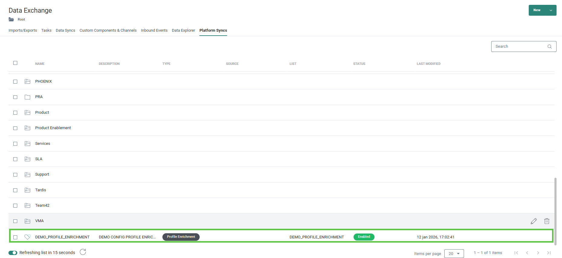 In the Data Exchange chapter; on the Profile enrichment tab, you can access the profile enrichment created earlier.