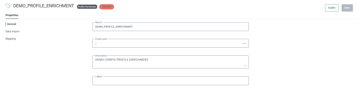 You can make changes to a disabled profile enrichment configuration. This includes changes to the general properties the data import options as well as the mapping. Use the Save button to store the changes.