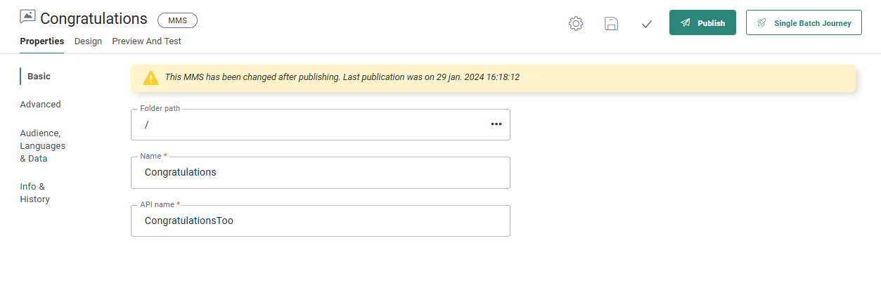 - API Name — Give an API Name to this MMS. The name cannot contain spaces. The API name is used when the message is called from the API.