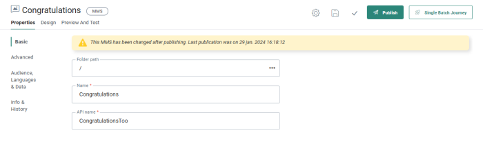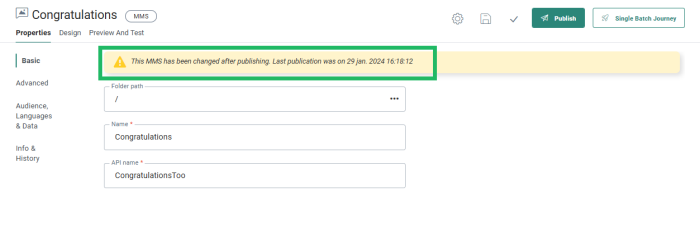 Note: At the top of the Properties panel, the current status of the message is visible. If the message has not been published at all, the status will indicate this. Also, when the message was edited and the changes have not yet been published, the status will inform the marketer of unpublished changes.![]()
