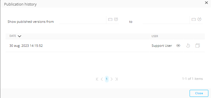 Every publish date and the person who performed this action is listed. A preview of the version is available using the eye icon.