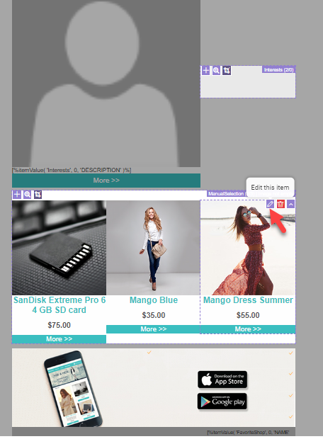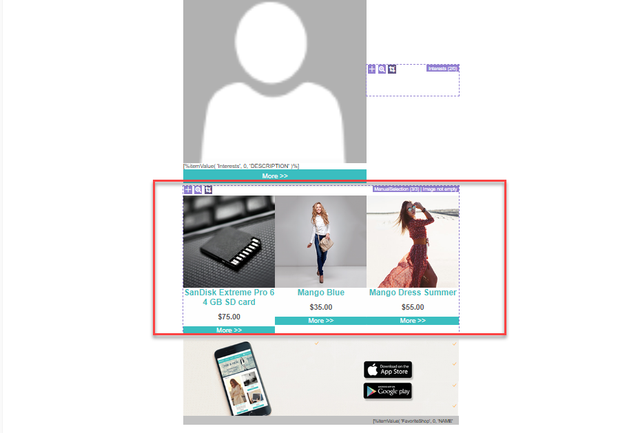 Note: If a template does not allow the message creator to select or add items, the repeater is then populated with items automatically, based on filters, matching, and maximum number of items defined in the data selection configured for the repeater.