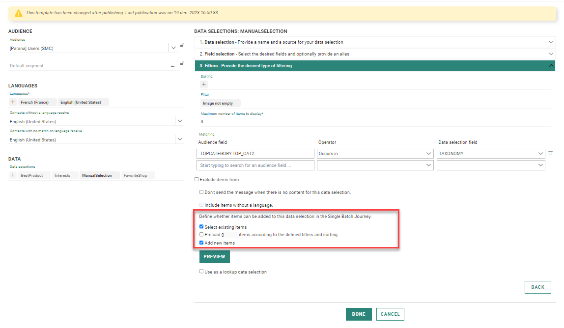 When the template allows it, items can also be preloaded in the message. The filters and sorting defined in the data selection configuration are applied when preloading these x items. (A maximum of 100 items can be preloaded.) When the items are preloaded, the user can make changes to them, by removing items, editing existing ones or adding new ones.