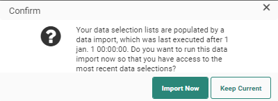 Preloading items will happen automatically when the option Preload items has been set in the template. However, when this option is used in combination with the option Allow fetching data from data imports linked to this data selection list, the items will not be preloaded immediately when opening the content. The user is first prompted to fetch the latest data.