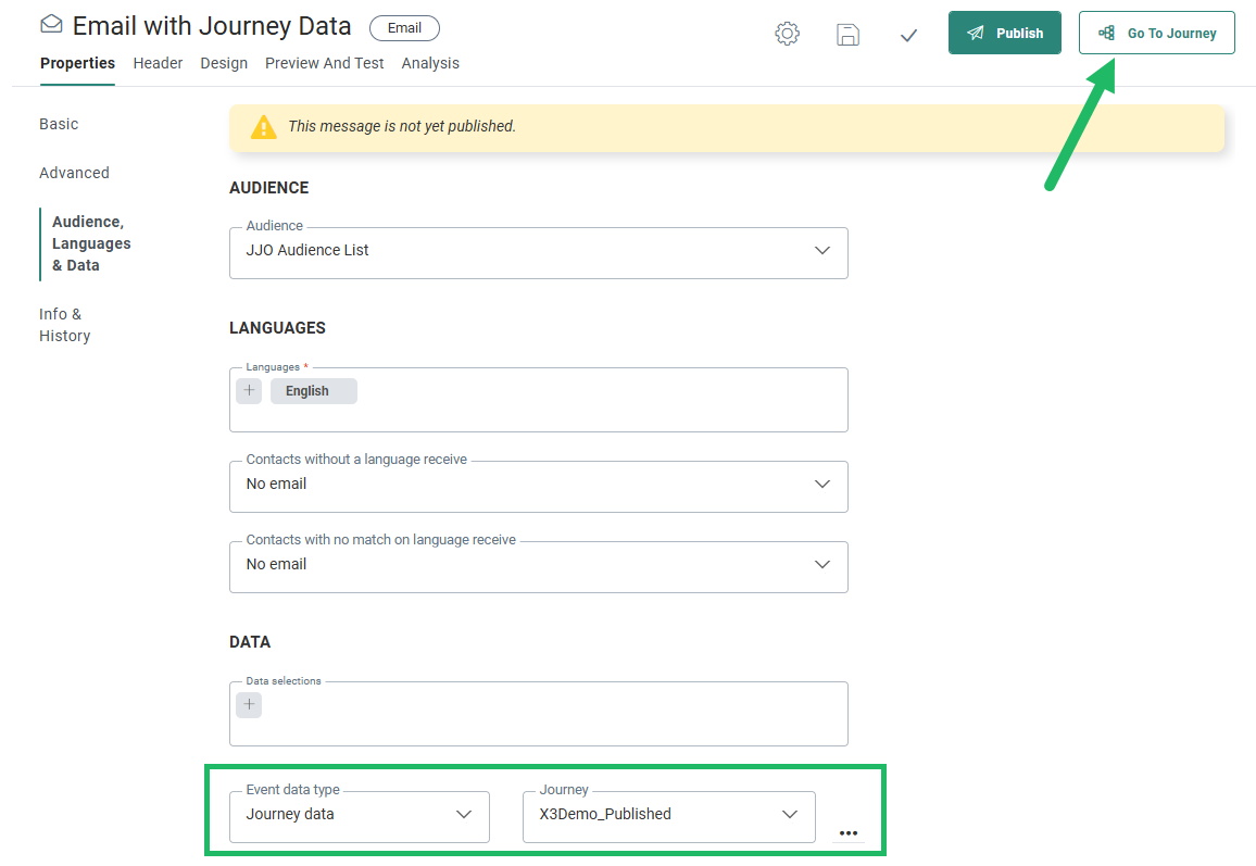 Note: When the message uses Journey Data and a specific journey has been selected in the properties, the Go to journey button will take you directly to the selected journey.![]()