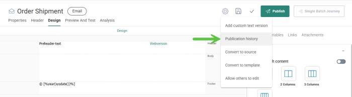 - The Publication history option in the Actions drop-down provides a historical overview of when the template has been published and who performed the action.
