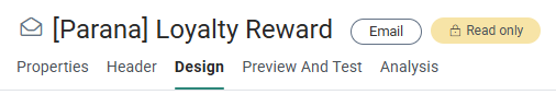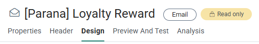 - Design — In Edit mode you can add layout and content components, define the email header, set constraints