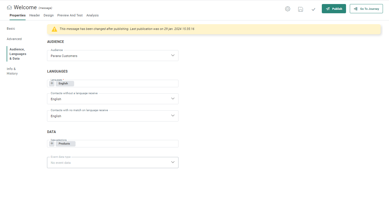 Note: At the top of the Properties panel, the current status of the message is visible. If the message has not been published at all, the status will indicate this. Also, when the message was edited and the changes have not yet been published, the status will inform the marketer of unpublished changes.![]()