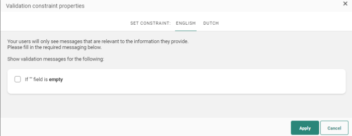 When done setting the validation rules, click Apply. The rules are now listed in the Validation rules section in the Field properties panel. Clicking a rule will take you straight to the Validation rules dialog where you can make the necessary changes.