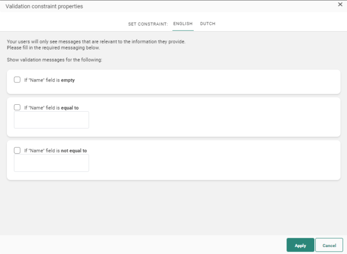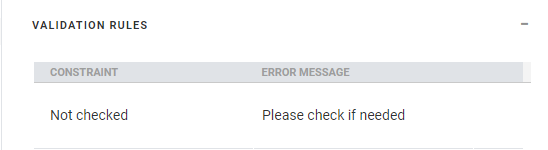 When done setting the validation rules, click Apply. The rules are now listed in the Validation rules section in the Field properties panel. Clicking a rule will take you straight to the Validation rules dialog where you can make the necessary changes.