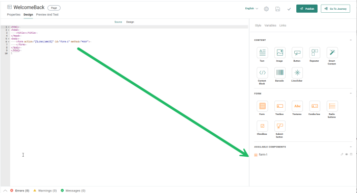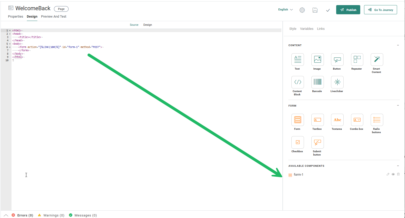 When a Form Component is dragged onto the page, a <form> tag is added and automatically a link is added to the form action.