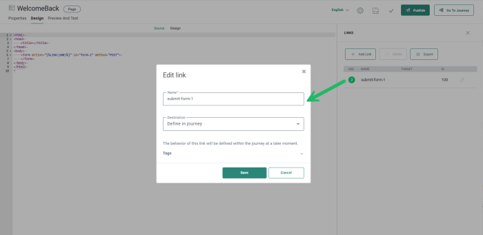 Action — The action attribute specifies where to send the form-data when a form is submitted. In this case the generated link will be used. It submits the data either to a URL, an existing journey or a journey that will be defined in the journey using this page. If you want to use a different link than the default one, select it from the drop-down and if it does not exist yet, click the Edit icon to define a new one.