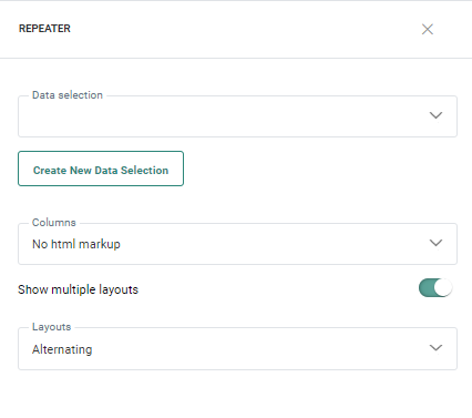 2. Select a Data selection from the drop-down list as the content source for this Repeater. If the data selection does not exist yet, click Create a new data selection to go straight to the content properties panel and define one. (For more information on this, click here).