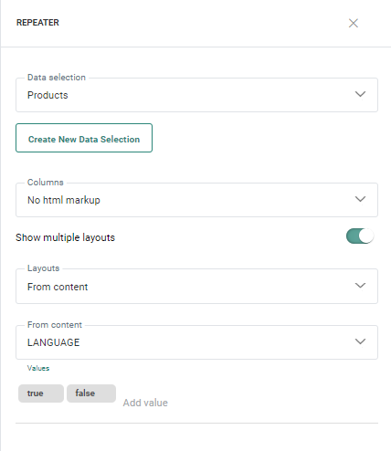 - For other field types, you can enter the possible values of the field and for each one of these values a different layout section is created in the Repeater. If no layout has been defined for a specific value the Other layout is applied. This Other layout section is automatically created in the repeater and needs to be configured as well.